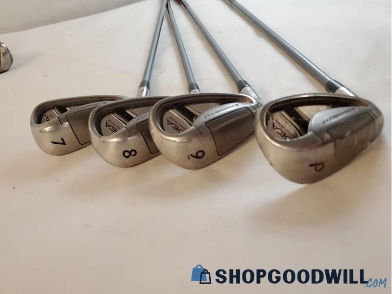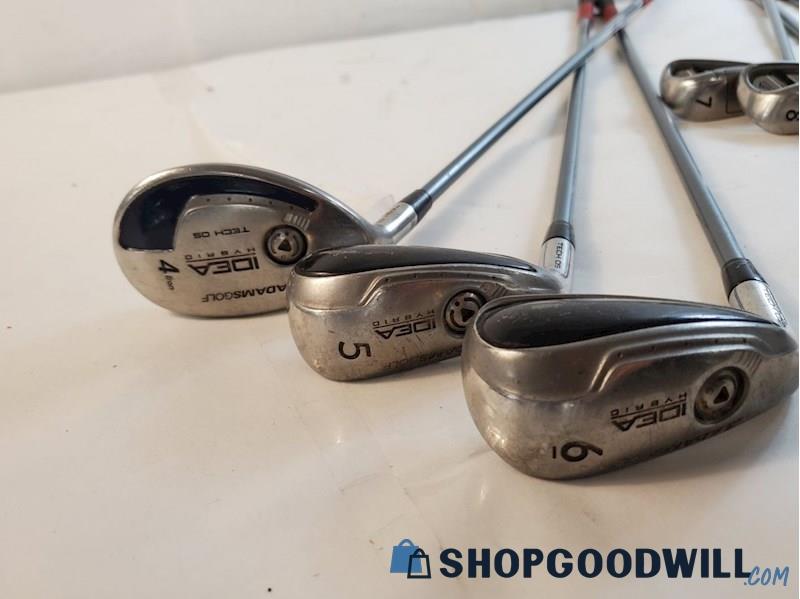 I got really lucky with shopgoodwill.com, and picked up a lefty set of Adam’s Idea Hybrid Irons (Pw – 4i/h) for about $50 with shipping. They have regular flex graphite shafts, and definitely fall into the super game improvement category. They have springy titanium faces, and wide soles with some sort of weighting in the sole. From the 6 iron up they transition into hybrids.
